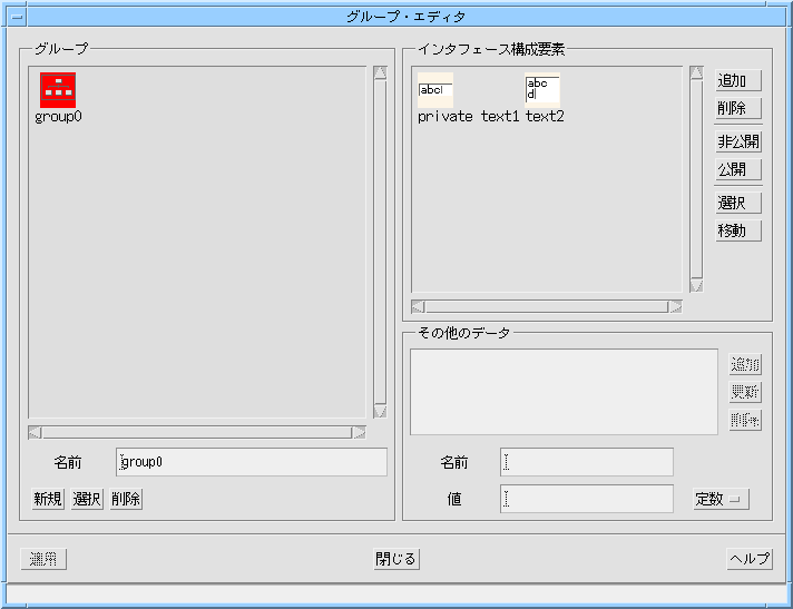 1. Sun WorkShop Visual によって定義される構造体へのポインタは、C コードの場合には sc_stdcs_t と呼ばれ、C++ の場合には sc_stdcs_c と呼ばれます。この構造体によって、ユーザーのルーチンがグループにアクセスできるようになります。内 部使用専用の非公開フィールドもあります。これは、コードを生成するディレクトリのファイル sc_groups_c.h で定義されます。