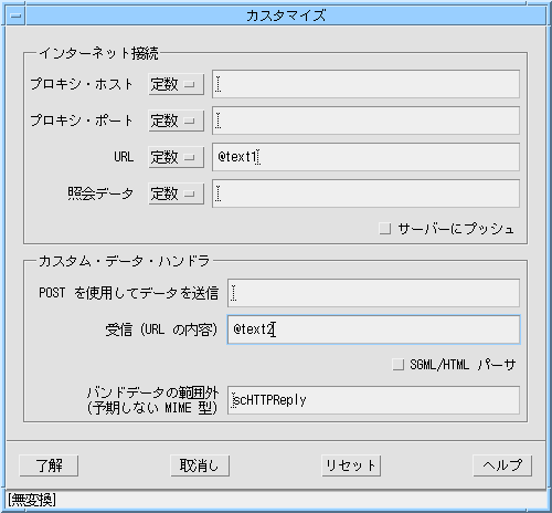 では、「指定したグループでの text1 というウィジェットの内容」を意味します。指定したグループとは、「コールバック」ダイアログで指定し たグループです。「接続」領域のフィールド (URL とプロキシ) でこの表記法を使用すると、コントロールの内容が取り出されます。これを「受信ハンドラ」フィールドで 使用した場合には、text1 の内容にサーバーから受信したデータを設定するものとみなされます。
