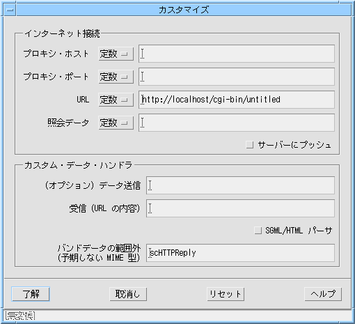 「カスタマイズ」ダイアログは、オプションメニューから「thin クライアント」を選択した場合と「インターネット」を選択した場合とでは、その表示が若干異なります。 唯一の相違点は、送信カスタムデータハンドラ・テキストボックスのラベルです。その理由は、Sun WorkShop Visual が、2 種類のアプリケーションに対して異なる HTTP メソッドを使用するためです。「thin クライアント」が選択されると、Sun WorkShop Visual は POST プロトコルを使用します。デフォルトでは、「インターネット」が選択されると、Web ページだけを取り出すものと想定して、Sun WorkShop Visual は GET プロトコルを使用します。これを変更して POST を使用するには、カスタム送信データハンドラを使用します。詳細については 「カスタムデータハンドラ」を参照してください。