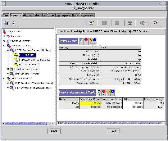 The modules also send service requests periodically, according to the parameters of the requests, and measure the response times of the requests. You can also group a set of Sun Management Center modules that are monitoring various services and view the high level summary of their status. The logical grouping of the modules monitoring the services are represented in a composite object called the service object. The high-level summary of the status of services is displayed in a new graphical user interface (GUI) called Service Manager. This new GUI can be invoked from the Sun Management Center 3.0 Java console.
