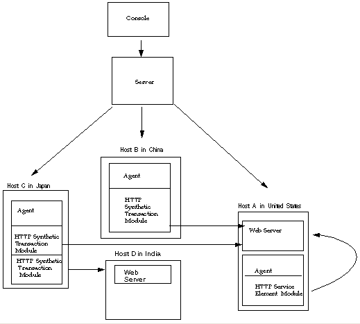 Host D has a web server running, but does not have an agent installed. This means the system administrator can not monitor the services locally. However, from Host D the services can be monitored remotely. The HTTP Synthetic Transaction modules loaded on Host C enables the remote monitoring of the web server on Host D.