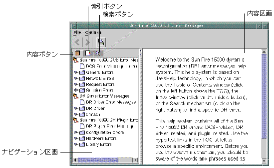 標準的な JavaHelp システムビューア hsviewer によって、DR エラーメッセージヘルプシステムが表示されます。このビューアは、図 3-1 に示すように、ツールバーと 2 つの区画 (内容区画とナビゲーション区画) からなります。