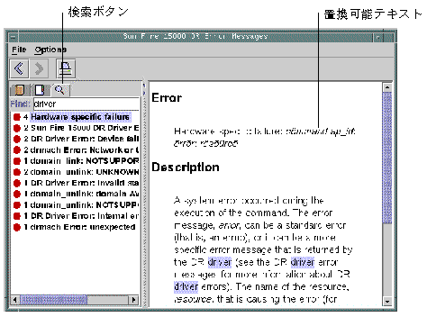 エラーメッセージを検索する前に、そのエラーメッセージのテキストの特定の文字列を検索してください。また、置換可能な文字列として処理されるため、数値を使用しないでください。エラーメッセージ JavaHelp システムのウィンドウを以下に示します。