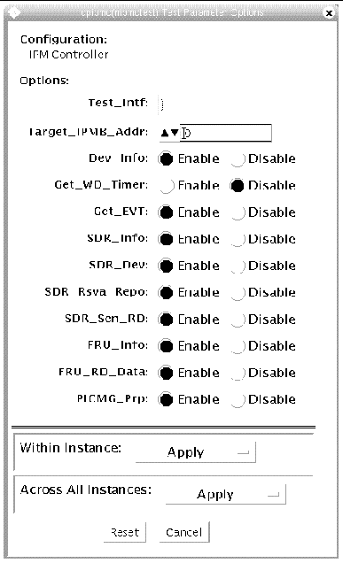 /opt/SUNWvts/bin/nipmctest -p 1 -scvrf -o intf=Open|ipmb, targ_ipmb=0, dev_info=Enable|Disable, wdtimer=Enable|Disable, get_evt=Enable|Disable, sdr_info=Enable|Disable, sdr_devs=Enable|Disable, sdr_rsva=Enable|Disable, sdr_senrd=Enable|Disable, fru_info=Enable|Disable, fru_rddata=Enable|Disable, ext_prp=Enable|Disable, dev=cpipmc