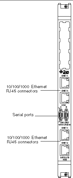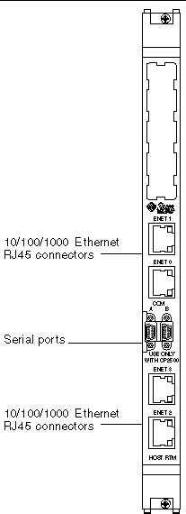 The Netra CP2500 RTM card provides additional I/O features through the CompactPCI RJ3 (labeled as J0201 on the RTM) and the RJ5 (J0401) connector interfaces to the Netra CP2500 board. Many I/O functions are provided on the rear transition module's own faceplate, as well as from headers mounted on the card. FIGURE 1-1 shows the faceplate of the Netra CP2500 RTM host module (RTM-H). FIGURE 1-2 shows the faceplate of the Netra CP2500 RTM satellite module (RTM-S).