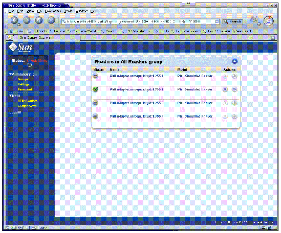 FIGURE 4-1 shows how a reader appears if you choose Administration --> Groups menu item. In this screen shot you can see that two of the readers are inactive and one is active. The delete Action icon will also be greyed out.