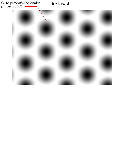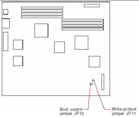 Note - When you are finished updating the flash PROM, return the flash PROM write-protect/write-enable jumper to the write-protect position to ensure system security. If your system is a Sun Enterprise 250, Ultra Enterprise 450, Sun Fire V240, Sun Netra 240, Sun Fire 280R, Sun Fire V440, Sun Fire V480, Sun Fire V490, Sun Fire V880, or Sun Fire V890, do not change the jumper; instead, return the front panel keyswitch to the Locked position ().