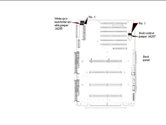*Jumper J4205 is factory-set so that the flash PROM is write-enabled. You use the keyswitch located on the front panel to write-protect the flash PROM. When the switch is set to the Locked position ( ), the flash PROM is write-protected. When the switch is set to the Power-On position ( ) or to the Diagnostics position ( ), the flash PROM is write-enabled.