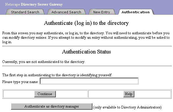 Figure 2.3 shows the authentication login screen for the default gateway. Administrators can use it to authenticate as the Directory Manager. The Authenticate as Directory Manager button is displayed only when a Directory Manager has been configured for the gateway.