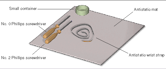 Place ESD-sensitive components such as the motherboard, memory, PCI cards, hard drives, and the NVRAM on an antistatic mat. The following items can be used as an antistatic mat: