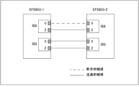 注意 - 在直接连接(无交换机)的 Sun Fire Link 群集中,连接故障路径的两个节点均检测并报告链接故障 -- 在图 10-1 中,为 SF6800-1 和 SF6800-2。当计算节点连接到 Sun Fire Link 交换机时,计算节点检测并报告“链接断开”消息。交换机还生成一条表明“链接断开”情况的错误消息。