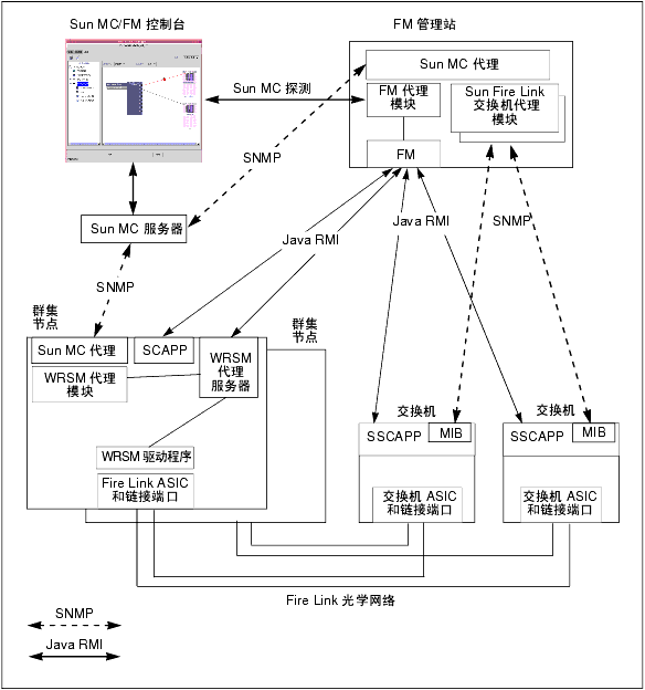 Sun Management Center/FM 控制台通过 FM 代理模块将群集管理指令发送到 FM,它使用标准 Sun Management Center SNMP 接口。它还通过同一 FM/FM 代理模块路径接收有关 Sun Fire Link 对象的状态及其它信息。