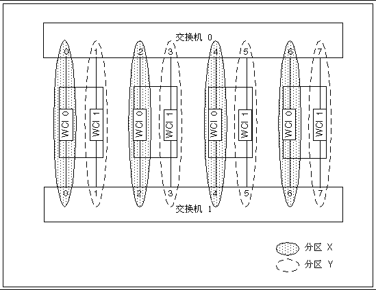 要实现这一点,每个域的两个 Sun Fire Link ASIC 分别映射到独立的分区中,并且分配单独的 RSM 控制器来分别管理两个分区。它控制的一个 ASIC 和两个光学端口充当主要网络接口。若主要网络接口发生故障,则使用其它 ASIC。图 6-3 和图 6-4 所示为双控制器群集配置示例。