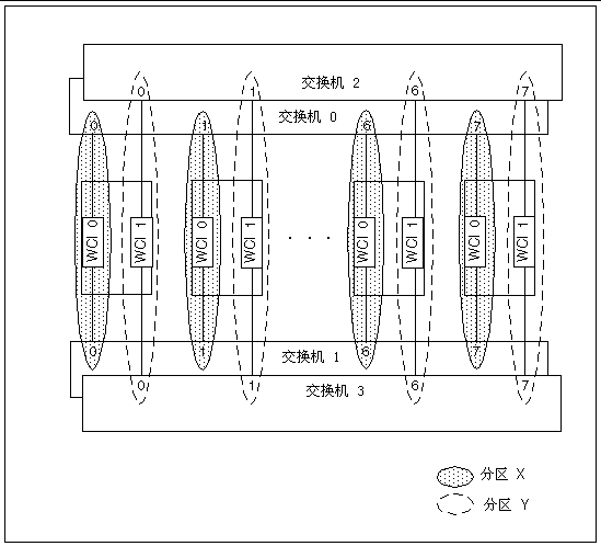 对于节点,此操作显示该节点中的 Sun Fire Link 组件的图标。此操作将显示每个节点中包含的 Sun Fire Link 组件 (WCI)。这些将以插槽 ID (Sn) 和 WCI ID (Wn) 来标记。