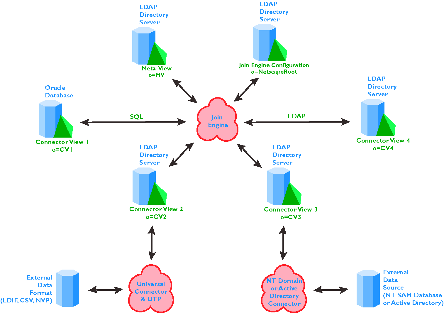 The join engine communicates directly with external data sources that format their data using the LDAP protocol (such as iPlanet Directory Server). Because of this, the join engine forms a direct connection with applications that provide data in LDAP format. In addition to LDAP, the join engine also "speaks" SQL. With this, the join engine can also form a direct connection with SQL-based data sources.