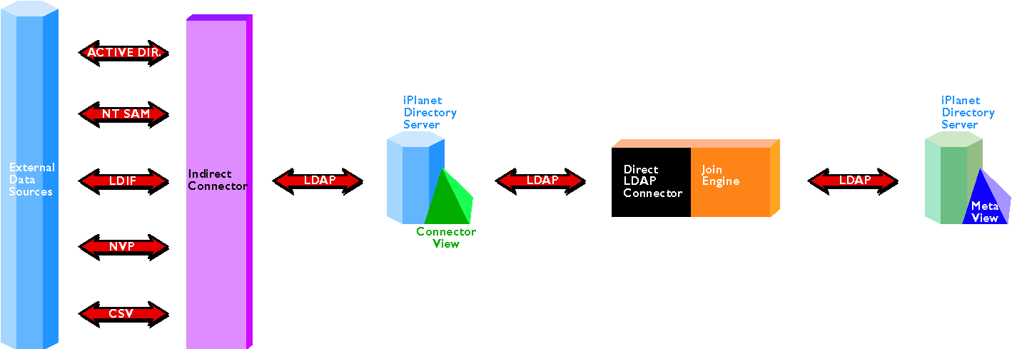 Using the Meta-Directory Universal connector, indirect connectors convert data contained in an external data repository into LDAP. The LDAP copy of this data is stored in a connector view that is hosted by iPlanet Directory Server. The join engine can then link the entries in the connector view with the entries contained in the meta view.