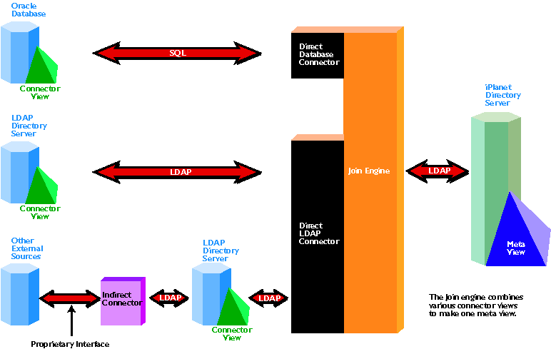 Sun ONE Meta-Directory integrates the disparate directory systems within an enterprise so their joined information can be accessed and managed from a single location, the meta view. The meta view is contained in an LDAP directory that is hosted by an instance of iPlanet Directory Server.