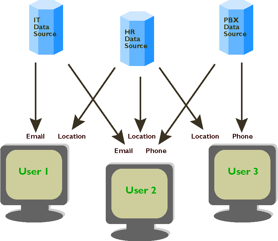 Figure 1-1 illustrates the difficulty of accessing data that is stored in several different data repositories. The figure is a simplified look at a problem that faces many organizations. In this simple scenario, there are three databases that store different information about a singe object, a person in the company. In this case, if a user wants to get the phone number, the location, and the email address of an employee, they must search though an assortment of different database systems.