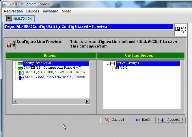 选择 "Automatic Configuration" 将创建一个包含系统中所有硬盘驱动器的虚拟驱动器。多个驱动器被配置为一个条带集 (RAID0),并显示为一个具有组合存储空间的虚拟驱动器。由于可能出现多点故障,因此这样也许并不可取。即,如果一个驱动器出现故障,系统就不会进行引导。此时,您只能保留一个驱动器,删除所有其他驱动器。或者,您可以使用 "Manual Configuration" 创建仅使用一个硬盘驱动器的虚拟驱动器。
