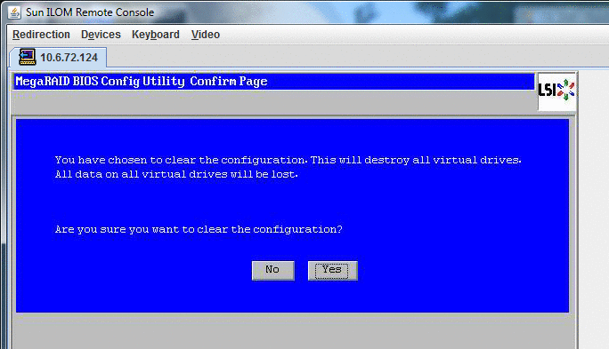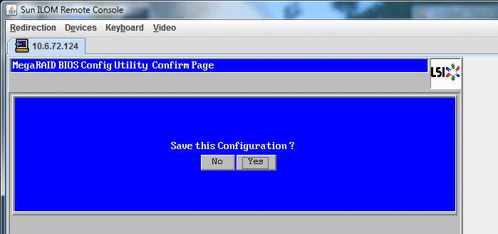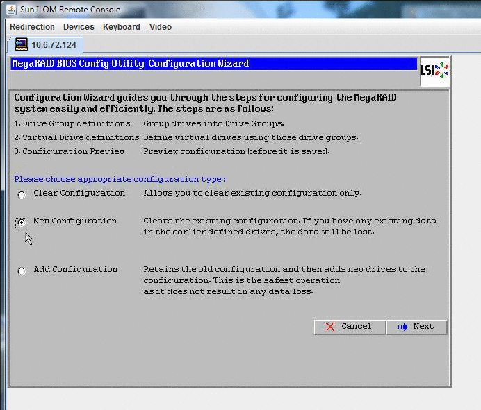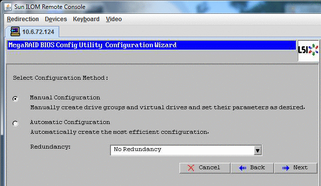 选择 "Automatic Configuration" 将创建一个包含系统中所有硬盘驱动器的虚拟驱动器。多个驱动器被配置为一个条带集 (RAID0),并显示为一个具有组合存储空间的虚拟驱动器。由于可能出现多点故障,因此这样也许并不可取。即,如果一个驱动器出现故障,系统就不会进行引导。此时,您只能保留一个驱动器,删除所有其他驱动器。或者,您可以使用 "Manual Configuration" 创建仅使用一个硬盘驱动器的虚拟驱动器。
