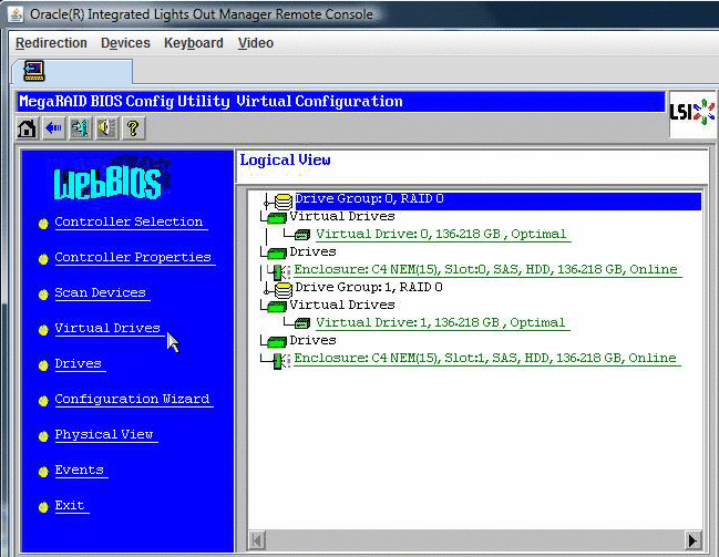 此时将显示 "MegaRAID BIOS Config Utility Virtual Drives Configuration" 屏幕。