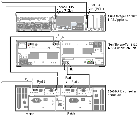 Note - The Sun StorageTek 5320 NAS Appliance must have two HBA cards (one in PCI slot 1 and one in PCI slot 0) to connect to two controller units. |