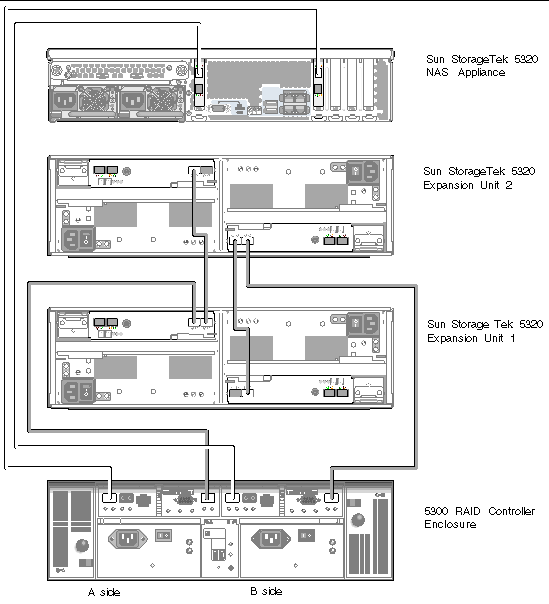 Note - Do not cable the expansion units to the controller enclosure if you have not upgraded the existing controller enclosure with the controller firmware revison level 06.19.25.10. If you do not upgrade the firmware on the controller enclosure first, it will not recognize the new expansion units. The required firmware patch can be downloaded from http://sunsolve.sun.com. You should also upgrade the NAS appliance to the latest OS before proceeding. |
