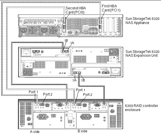 Note - The Sun StorageTek 5320 NAS Appliance must have two HBA cards (one in PCI slot 1 and one in PCI slot 0) to connect to two controller units. |