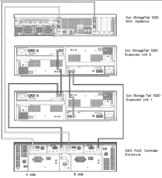 FIGURE 3-4 Connecting the Sun StorageTek 5320 NAS Appliance to Two Controller Units