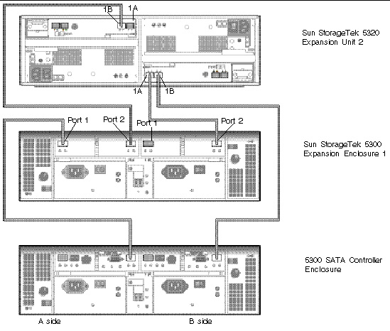 FIGURE 3-12 Controller Enclosure with One Expansion Unit Cable Interconnection with SATA Drives