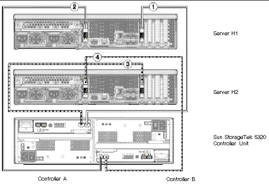 FIGURE 4-2 Connecting Pairs of HBA Cards to One Controller Unit