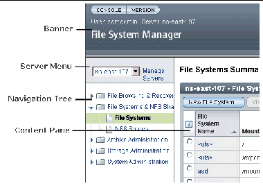 Displays the Servers page, which provides a summary of the servers that you have added to the browser interface. Clicking a server on the Servers page takes you to the File Systems Summary page, from which you can manage the file systems on that server.