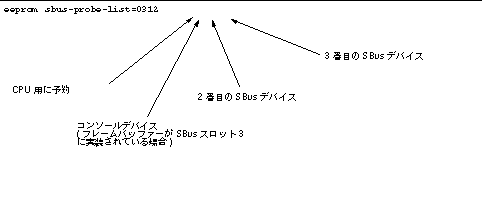eeprom sbus-probe-list 中の 0 を除いた最左端の文字は、最初に調べられるデバイスを示します。これは物理的な位置に関わらず、コンソールデバイスとなります。