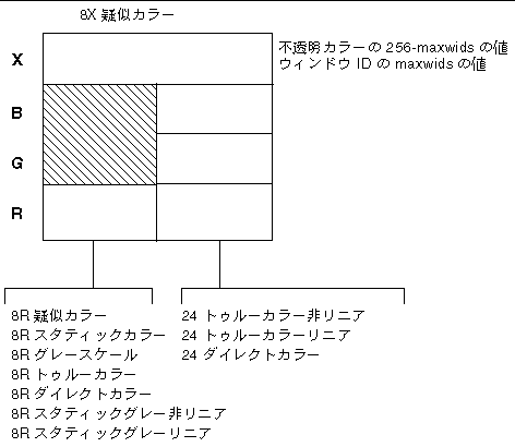 オーバーレイのピクセルコードには、可視的な色を表示する不透明なピクセルとして使用されるものがあります。それ以外のオーバーレイのピクセルコードは、アンダーレイのウィンドウの表示属性を制御するために使用されます。このコードは、ハードウェアのウィンドウ ID (WID) と見なされます。カラーマップの上位のコード (255 に近いコード) のいくつかは、WID として使用されます。WID の実際の数は、ffbconfig -maxwids オプションによって設定することができます。WID として使用されるオーバーレイコード 1 つにつき、オーバーレイのカラーマップのエントリ数が 1 つ減少します。maxwids のデフォルト値は 32 のため、オーバーレイには 224 の不透明なピクセルの値が存在します。