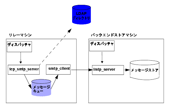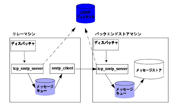 LMTP 配信SunTM ONE Messaging Server の MTA では、LMTP (Local Mail Transfer Protocol、RFC 2033 で定義) を使用して、複数層のメッセージングサーバーが展開されている環境でメッセージストアに配信できます。受信リレーとバックエンドメッセージストアが使用されるこのような環境では、メーリングリストの拡大などのアドレス拡張と自動返信や転送などの配信方法に関してリレーが重要な役割を果たします。バックエンドストアへの配信はこれまで SMTP 上で行われてきました。SMTP では、バックエンドシステムで LDAP ディレクトリの受取人アドレスを再度調べる必要があるため、MTA の全機能が使用されます。速度と効率性を向上するために、MTA では SMTP ではなく LMTP を使用してバックエンドストアにメッセージを配信できます。Sun Java System Messaging Server の LMTP サーバーは、汎用 LMTP サーバーとしてではなく、リレーとバックエンドメッセージストア間のプライベートプロトコルとして機能します。説明をわかりやすくするために、2 層展開を例にとっています。