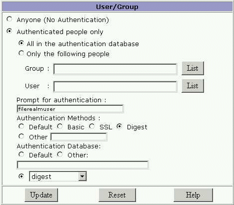 - 在下面框架中的“User/Group”页面中,从验证数据库下拉列表中选择“digest”。