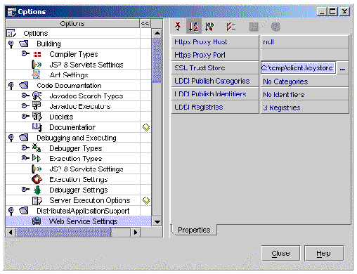 Note - The terms trust store and key store are used interchangeably in this document. In common security terminology, trust store refers to a database where an entity keeps trusted certificates of other entities, and key store refers to a database where an entity keeps its own keys or certificates. However, the two databases can be the same and the IDE does not make the distinction. FIGURE A-10 shows the IDE option, SSL Trust Store, which serves both purposes. |