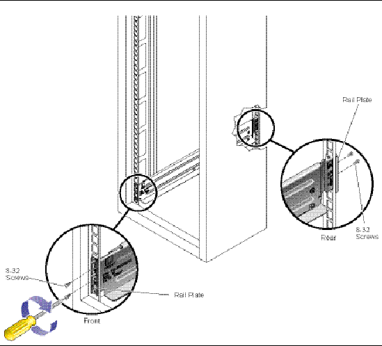 e. From the front of the cabinet, insert two 8-32 screws (four 8-32 screws for the J4400) to secure the rail to the cabinet.