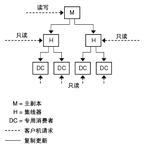 配置集线器集线器副本既可作为消费者副本也可作为主副本,以进一步将已复制数据分配至更多的消费者副本。集线器副本既能从提供者接收更新,又能将复制更新发送给其消费者副本。它们不接受修改,但可以将引用返回到主副本。