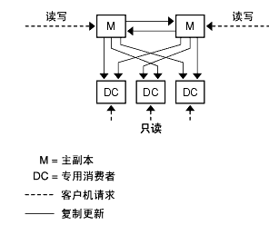 本文档还使用术语提供者和消费者,指的是参与复制协议的两种服务器角色。提供者是发送复制更新的服务器,消费者是接收这些更新的服务器。上图说明了以下关系: