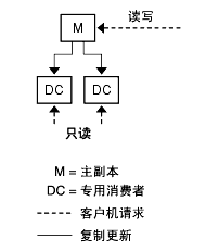 服务器中的已复制后缀称为副本。主副本是既能接受客户机读取操作也能接受其写入操作的副本。集线器副本和专用消费者副本是只能通过复制机制接收更新的只读副本。集线器副本可以从主副本或另一集线器副本接收更新,并将其转发给其他集线器副本或专用消费者副本。专用消费者副本只能从主副本或集线器副本接收更新。