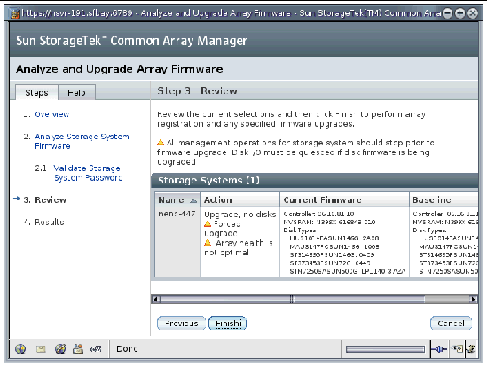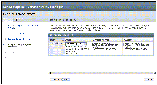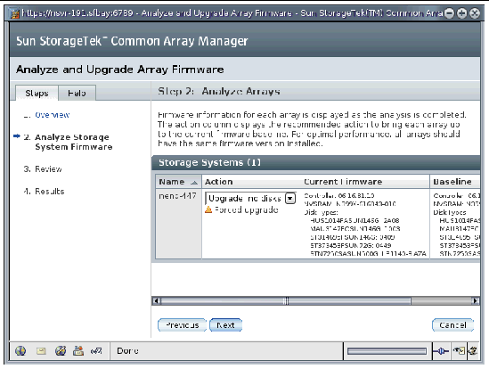 The Analyze Arrays page shows you the firmware version available from the Common Array Manager, and the firmware version currently installed on the array. You can select the action you want the software to take with respect to the firmware: