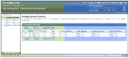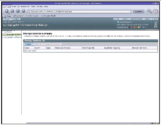 Once you have saved the Site Information page, on all subsequent logins to the Common Array Manager the Storage System Summary page is displayed. The first time the Storage System Summary page is displayed, it comes up blank with no arrays listed.