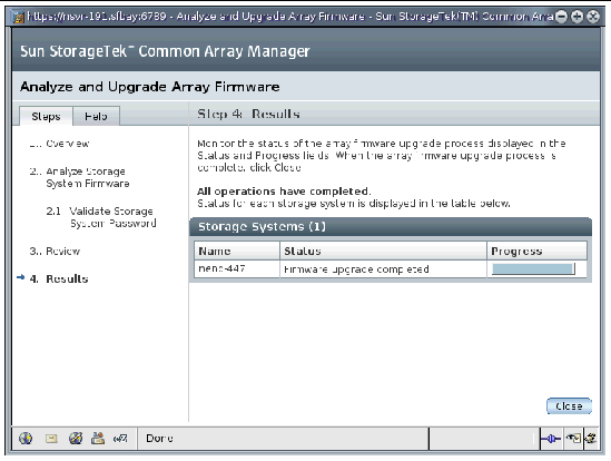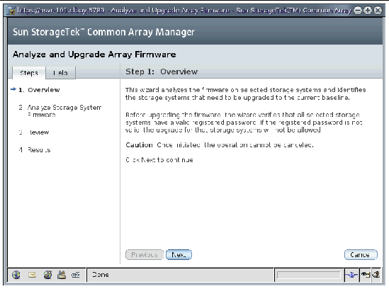 When you register an array in Common Array Manager, the wizard analyzes the firmware installed on the array. If the firmware placed on the host is newer than the firmware installed on the array, the wizard performs an array firmware upgrade.