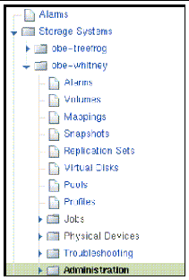 The navigation tree expands to display the configuration options for the selected array, including Administration.