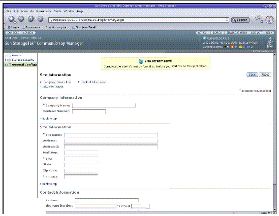 The first time you open the Common Array Manager after a first-time installation, the Site Information page displays.