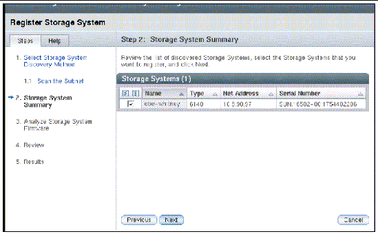 When you first log into the array's management software, select Storage Systems in the left navigation pane and on the Storage Summary page, click Register. The Array Registration wizard starts and you can choose to either search the subnet for arrays that are not already registered or to manually register an array as noted in the following sections: