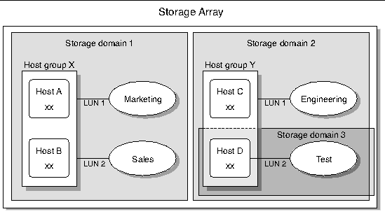FIGURE 4-1 shows how storage domains can be used to partition storage. It depicts a storage array configured with three storage domains, Storage Domain 1, Storage Domain 2, and Storage Domain 3.