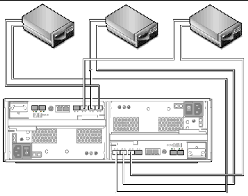 FIGURE 4-6 shows an example of a direct host connection of three data hosts with dual HBAs.
