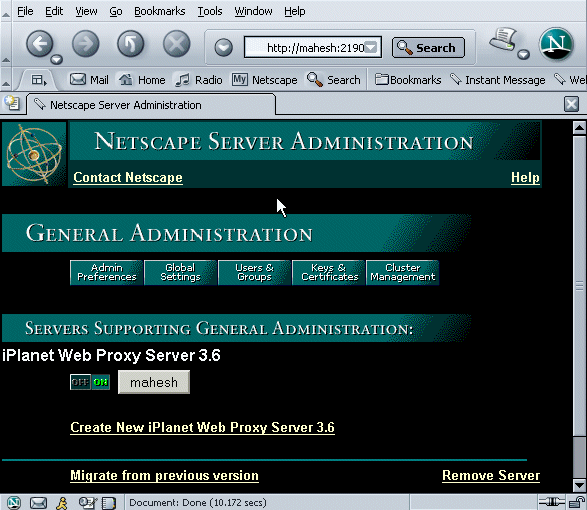 In the above URL, use the administration server's port number (not the port number for the proxy server) that you specified during installation. You will be prompted for a user name and password. Type the administration server user name and password you specified during the installation. The Server Administration page appears. For more information on the Server Administration page, see Using the Server Administration Page.